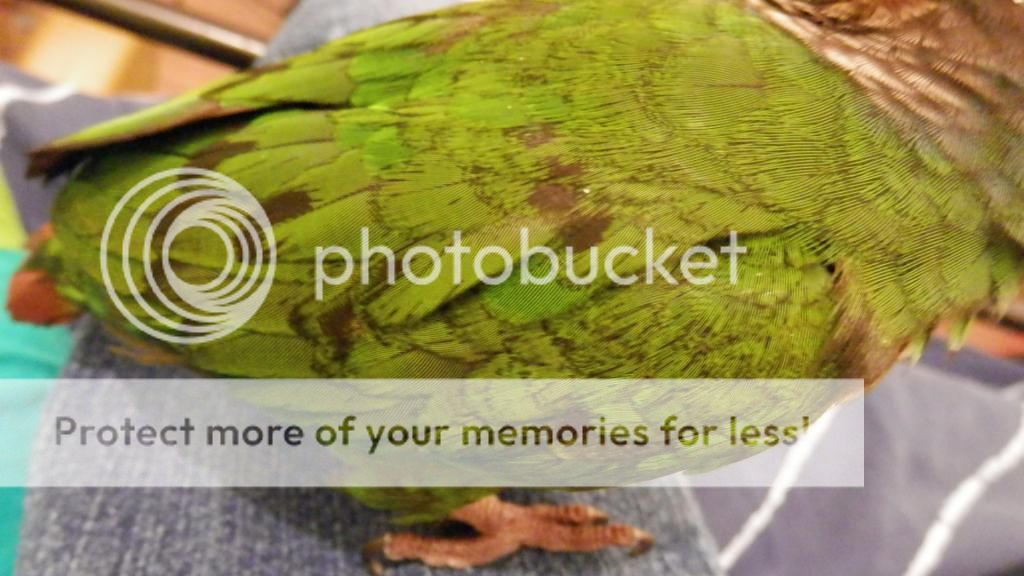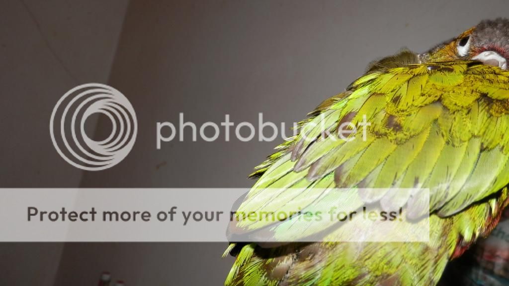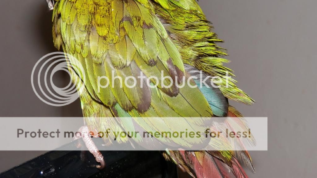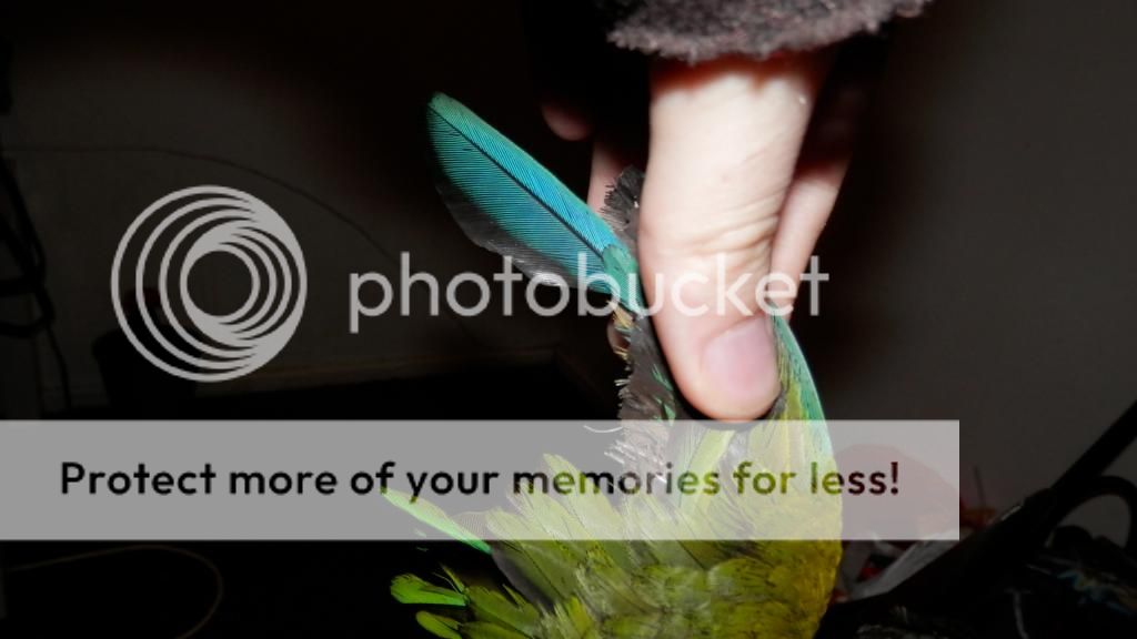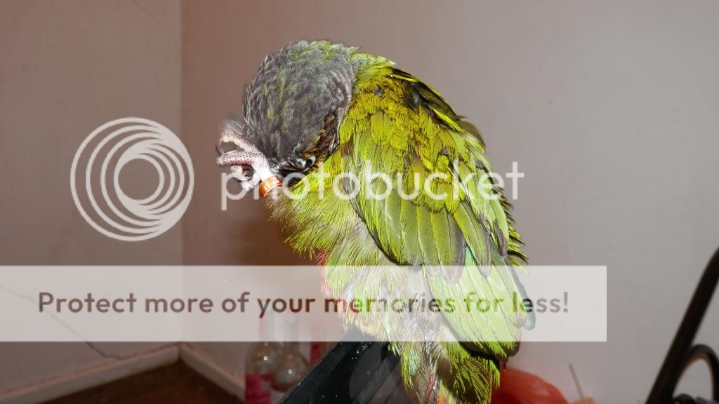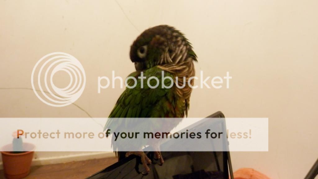 Cookie tries to preen Merle when I have them out together, but Merle opens his beak at Cookie, so I don't risk it. I think he can be a bit jealous if Cookie is on my shoulder and he isn't too. They did share some pellets though.