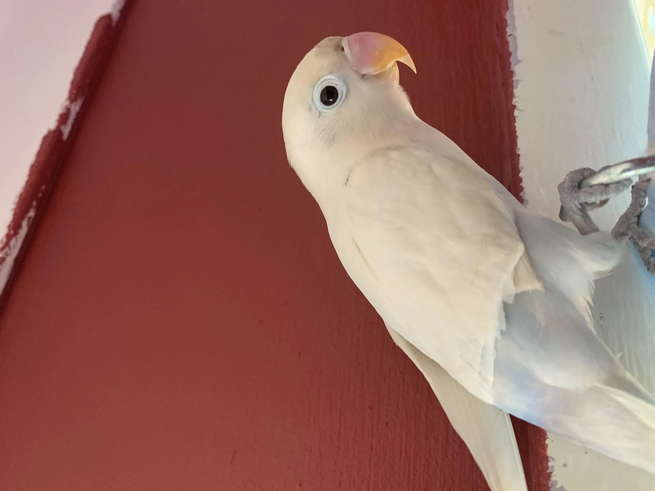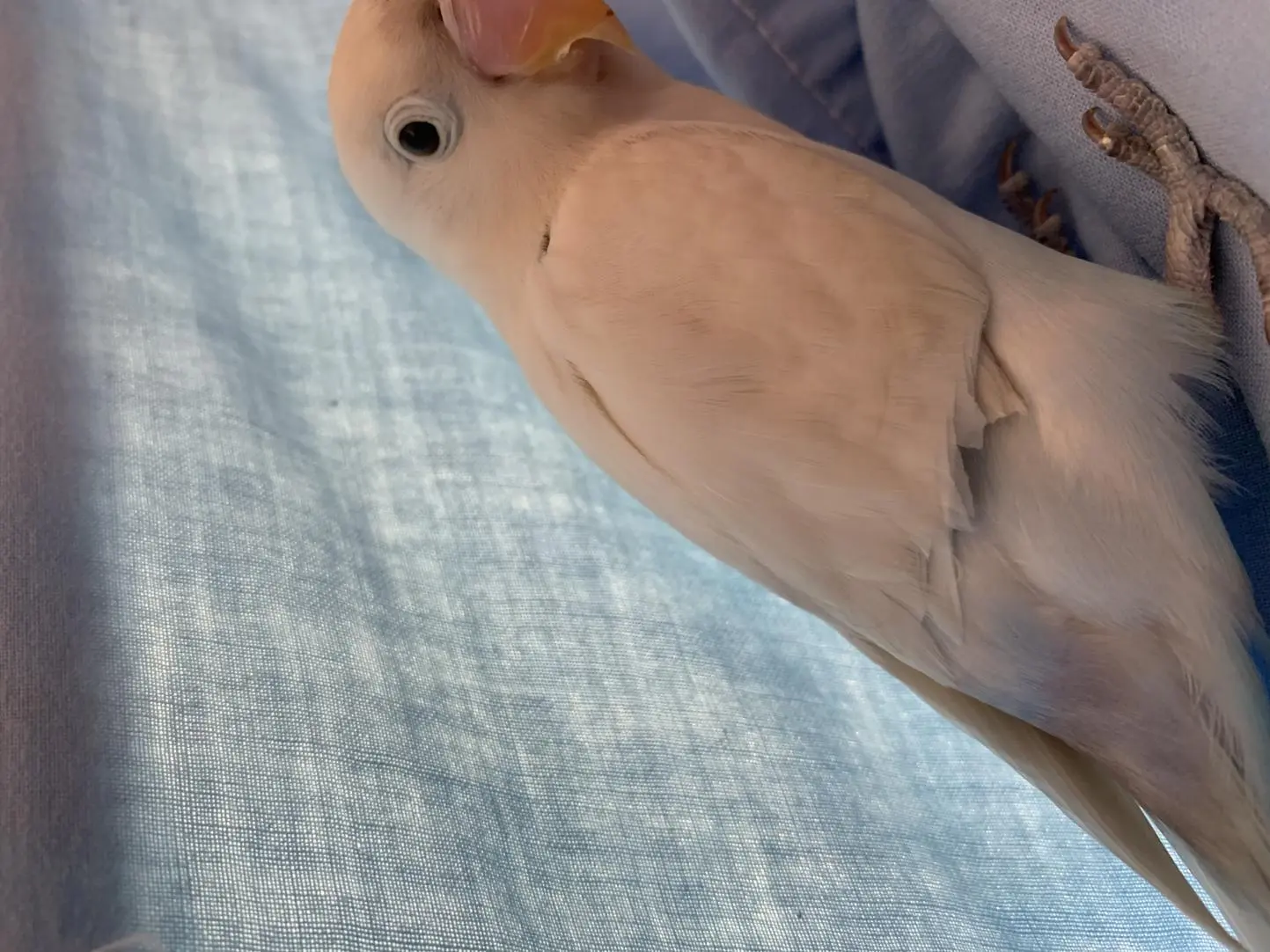 Basically, to start things off, we got 3 new lovies from someone who was neglecting them. All 3 had clipped wings, although 2 black cheeked lovies had their wings growing back and they could somewhat fly. The other is a white-ish lovie (similar to a blue opaline) and her wing looks like it's just been hacked right through the middle. I've had her for 3 weeks now (trying to hand-tame cause she can't fly at all) and it doesn't look like it's growing back.