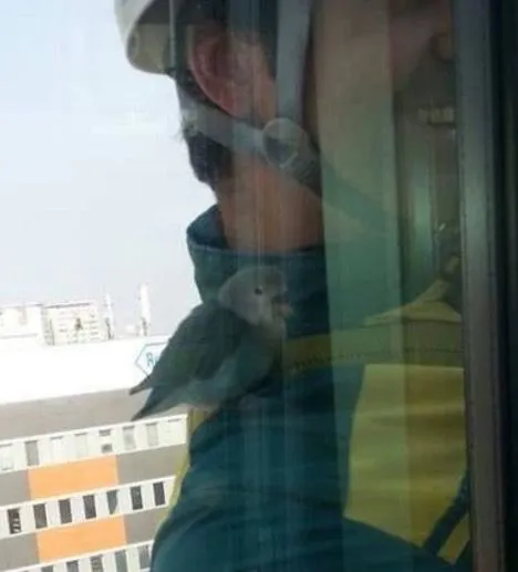 Going to work with my parrotlooks like we are in trouble while dangling from the top of the building while we clean windows. People inside the building pleasantly surprised...