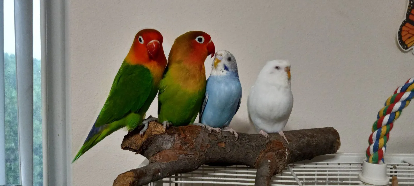 - Fang ({ab}normal grey cockatiel), Valentino (budgie), Jem (cinnamon cockatiel), Lovejoy(varied lorikeet), Peach (princess parrot)