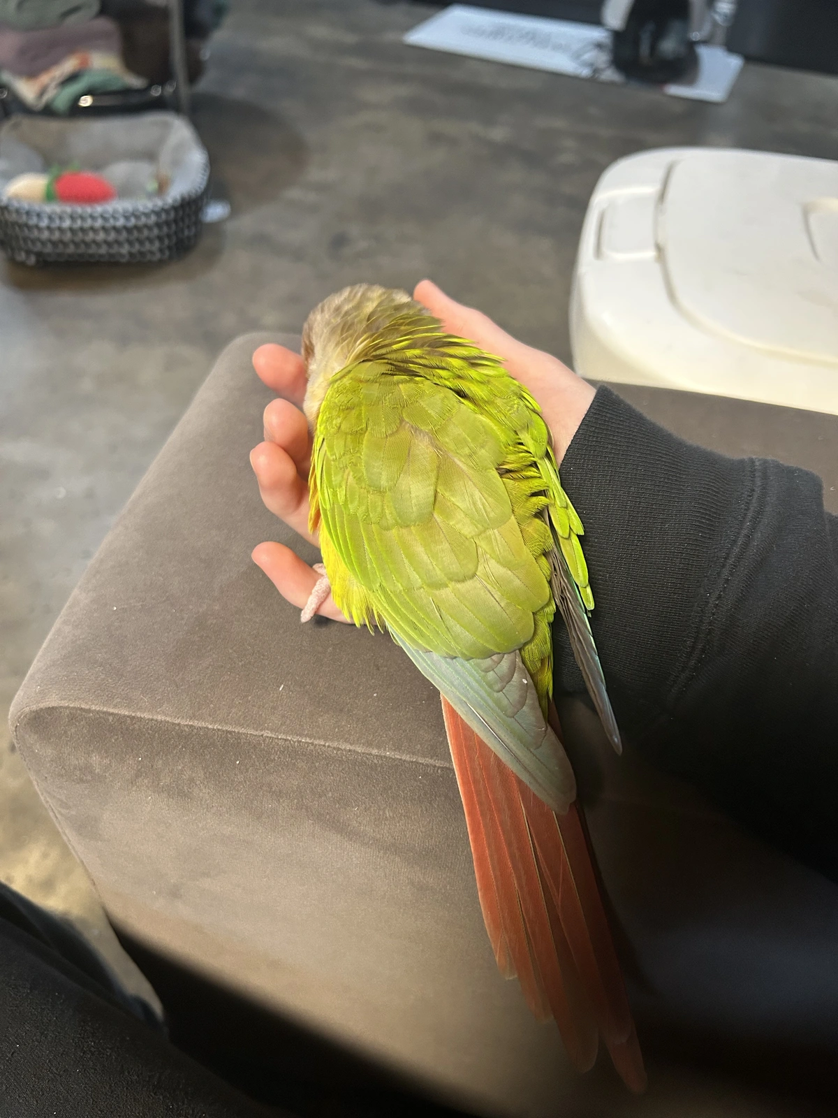 Wow! This is such a pretty picture!Solo having a stretch on my knee showing his wonderful flight feathers.