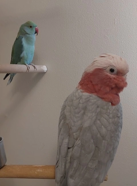 Wow! What a lovely pair!Here is my submission! Archie the Rose Breasted Cockatoo and Ozzy the Indian Ringneck. Together, they hit most of the pastel colors.