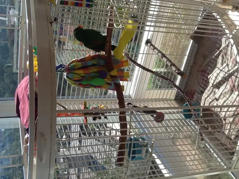 Everything look okay? He seems very comfortable! I am not comfortable with him on top play area yet. Too far down if he tries to fly. His favorite spot is on open door...just hanging out. Doing well with two declawed cats and one dog. 2 year old pup he would like to settle down before she approaches his cage - pup is learning very quickly.