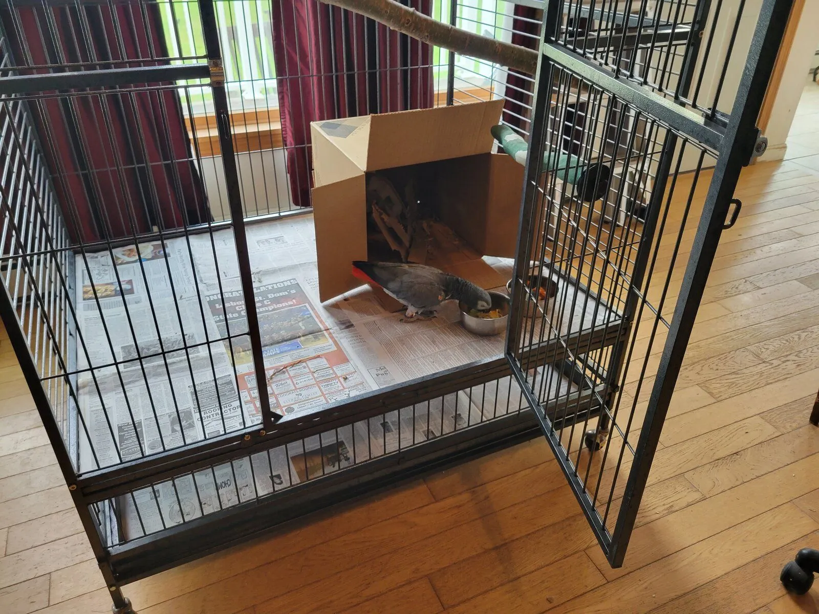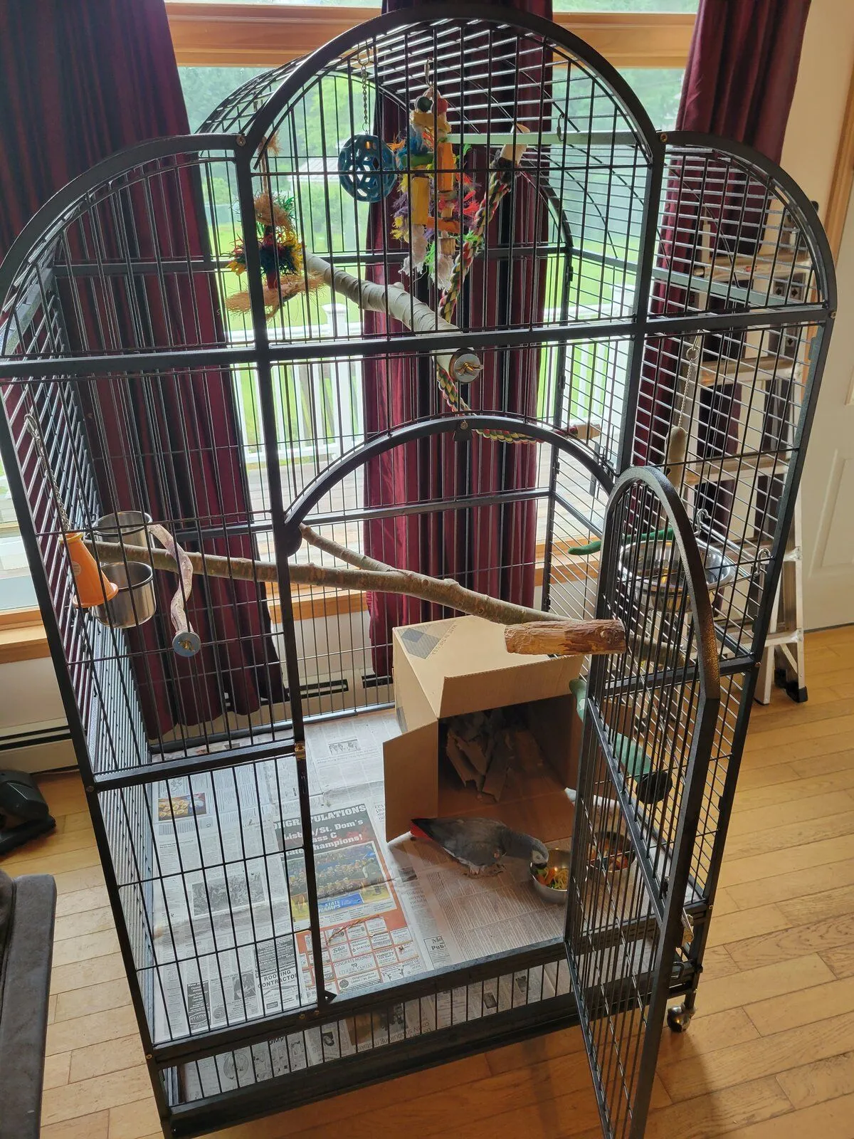 I had originally planned to pick him up and take him to the refuge for them, but after learning about him, I decided to foster him until he got settled, used to having attention and freedom from his tiny cage. So, it was cold and rainy in November. We had to get him in my carrier. Avery seemed comfortable with the son, so I had to explain to him how to get him to step up and take him out of the cage. He looked kind of scared about it and asked what if he flies away? We're inside, and he hasn't been able to even flap his wings in 15+ years. Where's he gonna go? He timidly took him out, and he stepped right up to my hand and just hung out with me while we all talked.