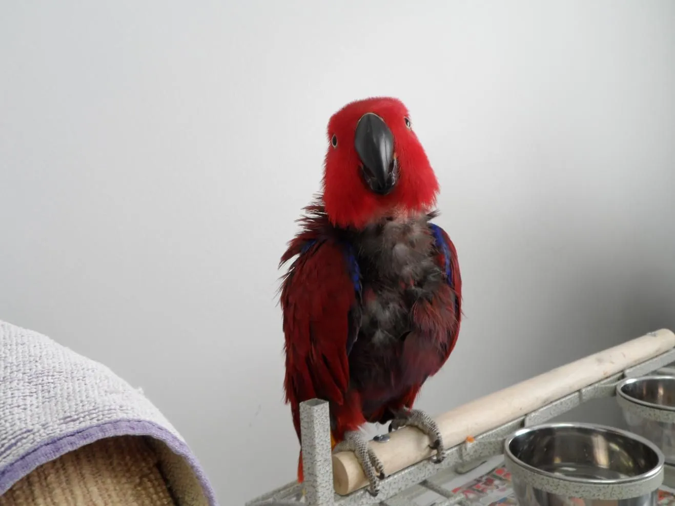 For a little background on Molly. She was brought into the bird shop where we got her from a little over 3 weeks ago. She was on a seed only diet with no veggies or fruit I was told. She was brought in by a man and from what we were told Molly was very hostile toward her owner. Molly has plucked herself quite a bit but alot of her down is coming back in now. The owner of the bird shop said since she got there he hasnt seen her pluck and her down only started to come back once she arrived there. Molly has been to the vet and had blood work and fecal tests done and she is very healthy 3 year old Vos Ekki. Below are a few pictures of Molly. Let us know what you think about her feathers.