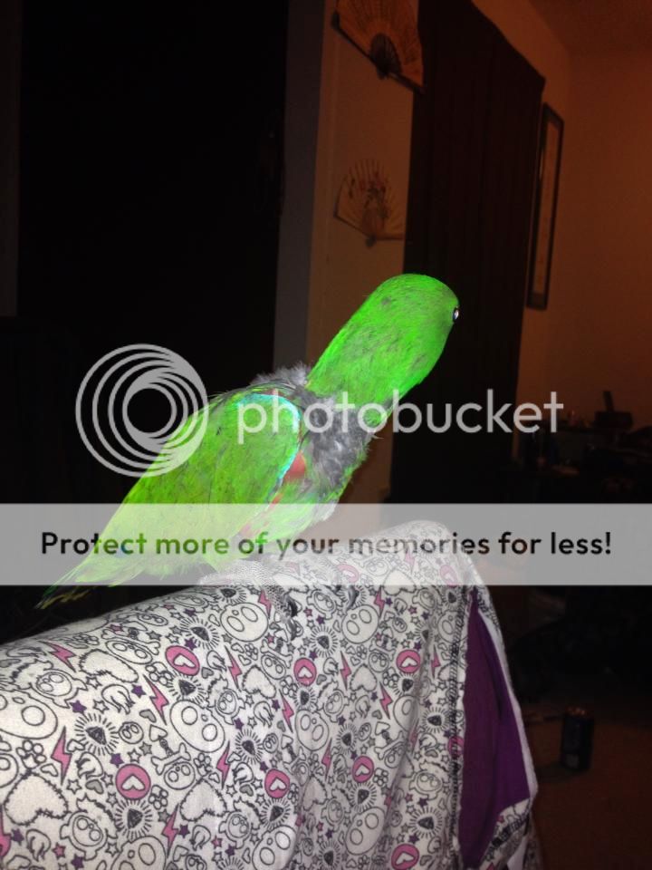 So far he's stepped up on Brad all by himself!! and because of that his reward was being put in the cage, which he kept going back to since I guess it's his "comfort zone". We can't get him to take food from our hand so we're gonna pick up some yummy fresh foods for him also. You can see that he used to pluck but hopefully that will not happen again.. with enough TLC