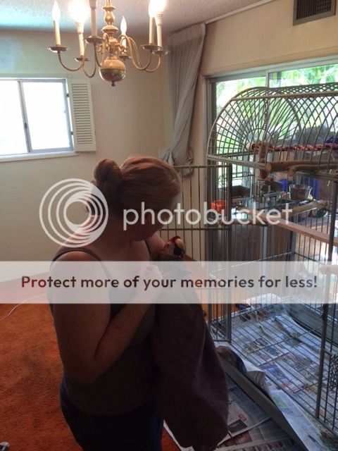 Then she tried to trick me by being nice and holding me like a human baby. Doesn't she know I'm not a baby! And I'm not a human either! I'm a big girl and I'm a parrot. This is not how you're supposed to hold me!