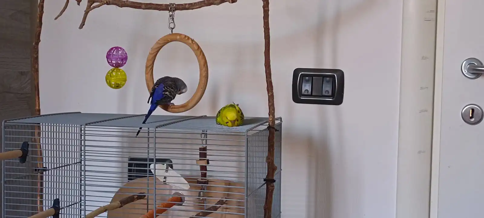 I like the cage top playground! Very cute budgies. I see your girl is taking a nap. One of my girls, Elan, likes to sleep on top of the cage the same way. She even closes her eyes and rests her head on the cage- I call it her face-plant nap. Here's a picture.