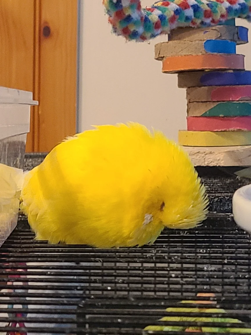 What a cute little floof we got there!I like the cage top playground! Very cute budgies. I see your girl is taking a nap. One of my girls, Elan, likes to sleep on top of the cage the same way. She even closes her eyes and rests her head on the cage- I call it her face-plant nap. Here's a picture. View attachment 82028