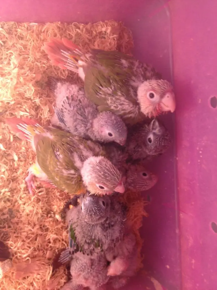 I haven't been on this week as we are away on holidays, but I just had to share this photo I received from my breeder yesterday! These yellow sided GGC babies are now 3 1/2 weeks old and one of the little boys will be mine in a few weeks! You can see that some green feathers are starting to come through now! The breeder is fantastic, sending me updated photos every week and also asked if I would like to bring my kids to see the birds in person, so next week we will get to visit them yay!