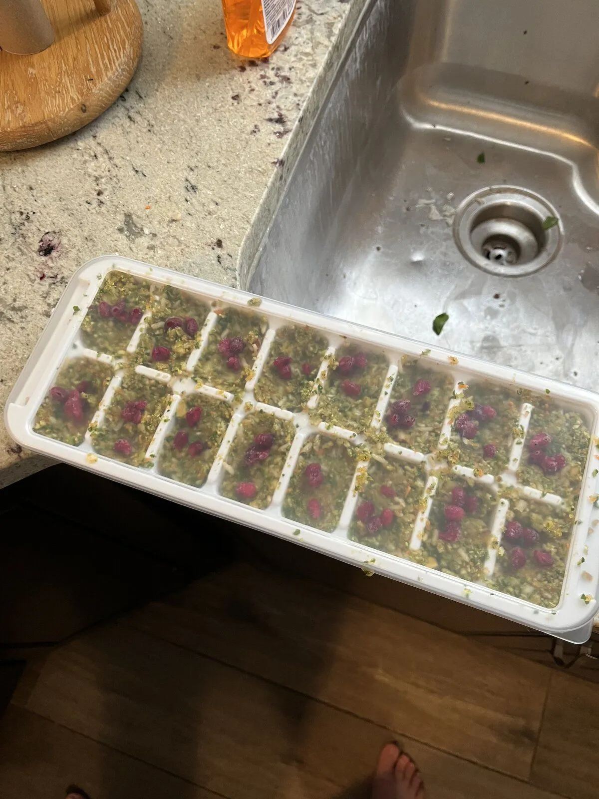 After processing I portion it all in an ice cube tray. I put 3 frozen pomegranate seeds on each cube as a little treat hehe.