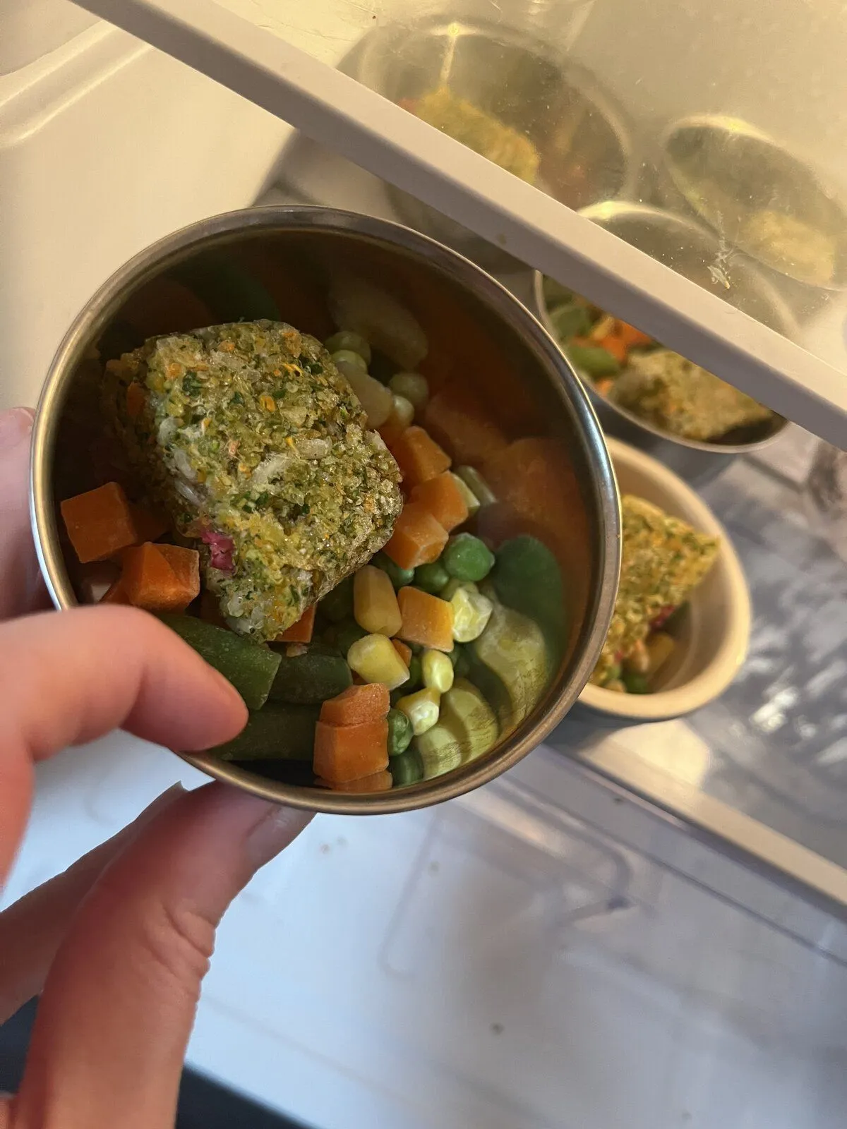 That brings me to my daily prep. Every night before bed I grab bowls. I put 3 spoonfuls of mixed veggies in each bowl first, then 1 cube of chop. I put the bowls of frozen portions in the fridge to thaw overnight. Then, when I wake up in the morning I put 1 spoonful of rolled oats on top for heart health, and that's breakfast!