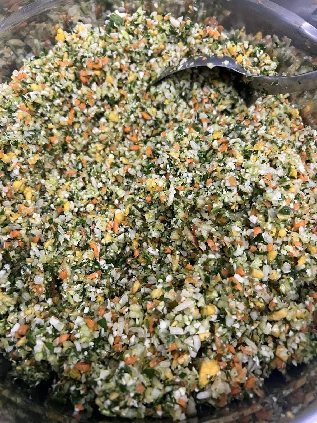 I use a food processor and focus on veggies that are on the dry side, because I find lower liquid content makes for better freezing. It's important to dry each veggie after washing because a little bit of water in the food processor turns what would be veggie bits into a veggie paste instead. If the ingredients are dry, everything is processed to tiny tiny bits and stirred together, then the rice is added.