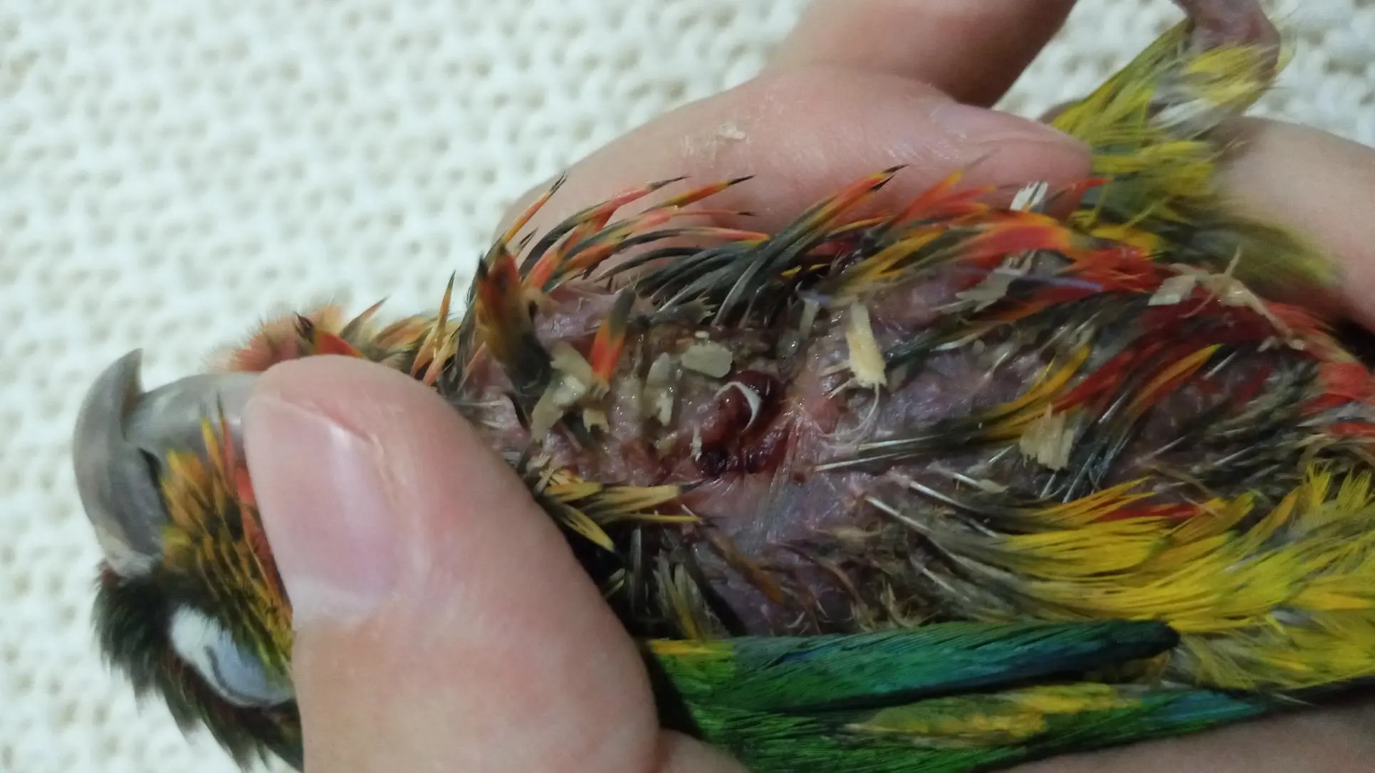 I visited four before one finally diagnosed it with gangrene (the ones before failing to notice) as a result of infection due to a fight with its fellow conure. He removed the gangrene and found a small hole between the neck and chest area, cleaned it up with iodine before spraying it with anaesthesia and stitching it closed.