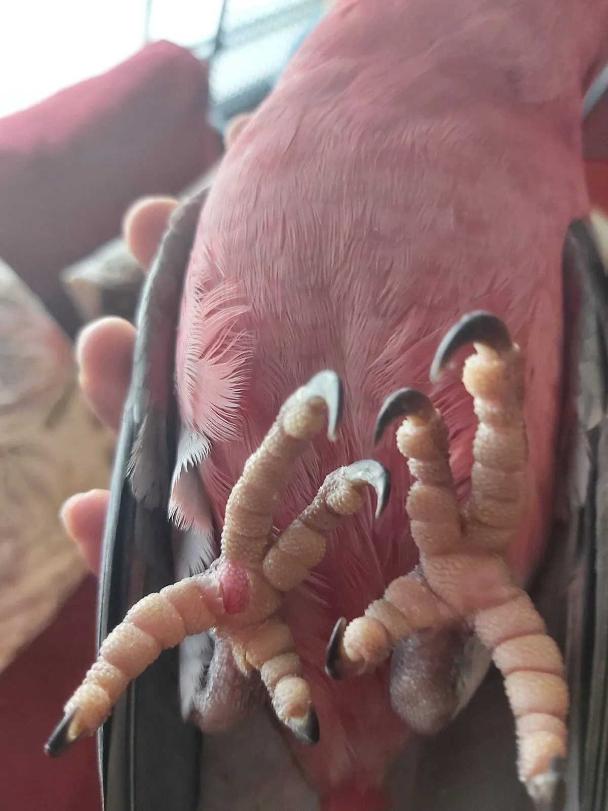 Hi, I was playing around with my bird today and I saw a red spot on the bottom of his leg. I'm a bit concerned since it looks like some sort of wound and tried researching it but I can't tell if it's bumblefoot or because his foot is dry. Can anyone help please?