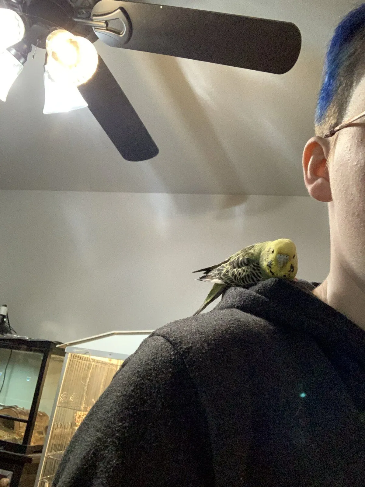The other budgies would bully her sometimes, I shouldāve gotten her her own cage but I didnāt have any money of my own at the time hardly.