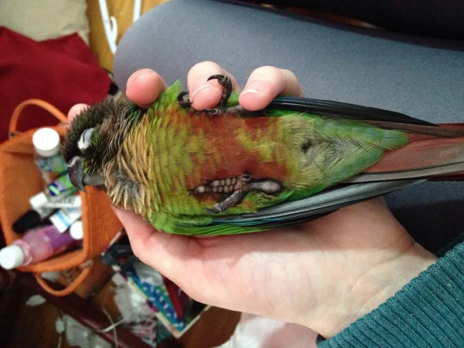 Now, the first thing she does in the mornings when I take her out of the cage is fall back on my index finger and have my cup her with my left hand. We just very recently worked up to her letting go of my right hand, but she still grasps the fingers in the hand she's laying in. Once in a while she'll totally let go.