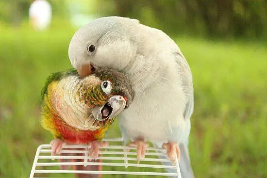 cinnamon blue Quaker parrot !Lol, the gcc(?) looks almost like it's screaming "help". What kind is the white/grey bird?