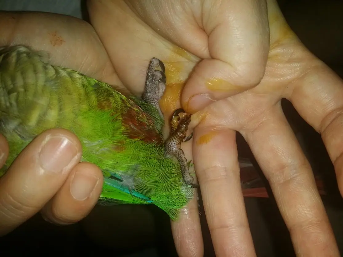Run a little peroxide over that (not any other disinfectant, ONLY hydrogen peroxide, other disinfectants could leave a toxic residue), then run under cold water, dry with sterile gauze ASAP and then call the vet. If you don't have hydrogen peroxide on hand, then just run the foot under cold water and dab with sterile gauze to at least stop the bleeding. Infection can set in so quickly, it is important to treat the wound as best as you can at home then get the bird into a vet who can examine the wound, further treat it and give precautionary antibiotics if he/she feels it is necessary.