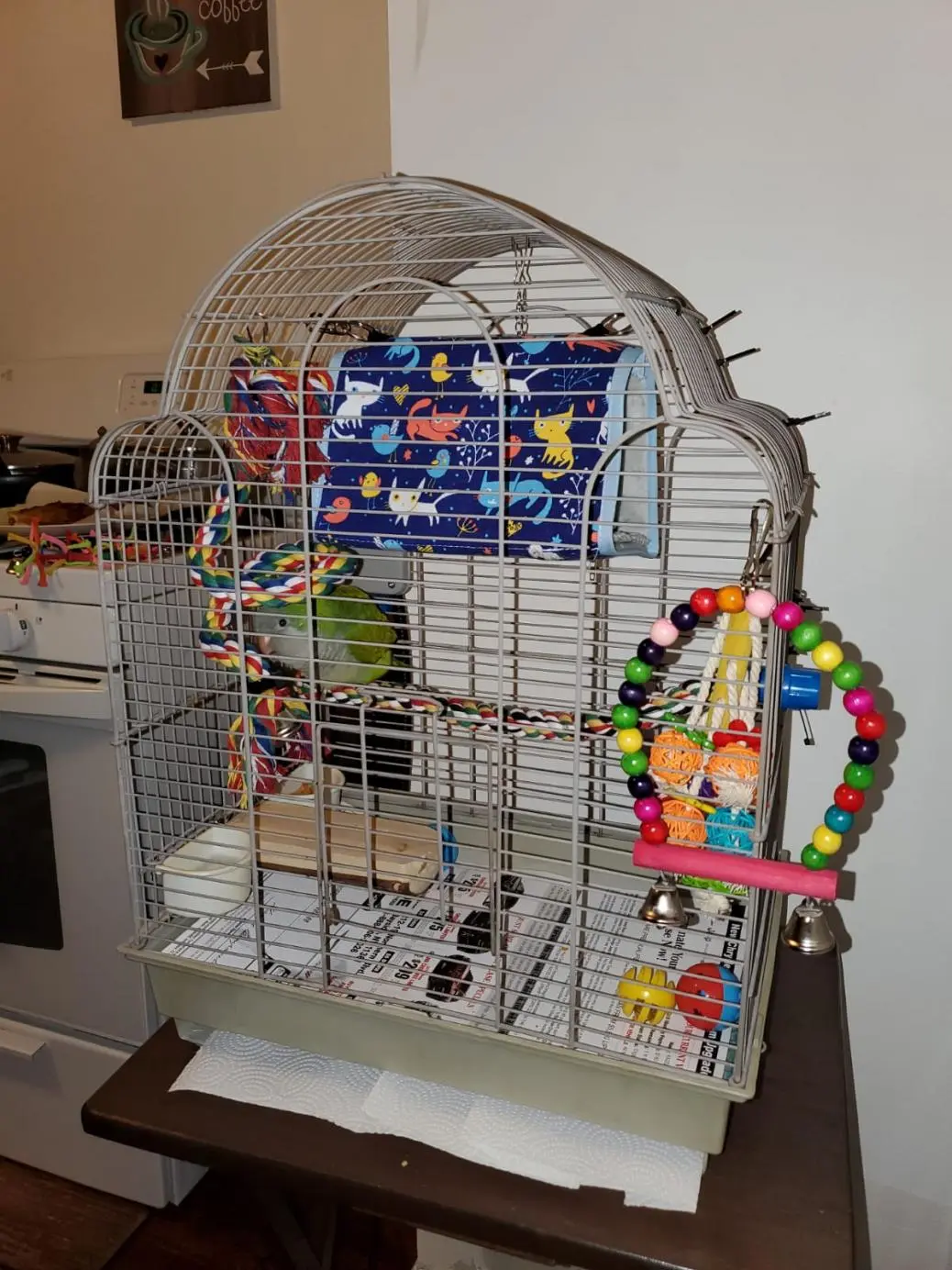 A little back ground, Mango (think it's a boy) is 12 weeks old and he was handfed. He is on a pellet diet and is sweet, occasionally nibbling a little but nothing hard. The cage he currently has is small but his new cage will be arriving in 2 days. He really hasn't spent much time in his cage other than to sleep and eat, mostly he hangs out on our lap or on his little play gym but he doesn't play much still . (Will attach pictures of everything). He likes to get head scratches and will play with some toys outside of his cage but not for long. He will step up if we bribe him with one of his pellets, sometimes he will step up without being bribed much as long as he is out of the cage. He has been at my girlfriends apartment now for 5 days.