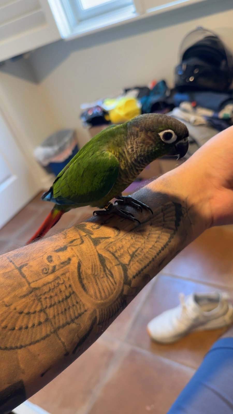 Hi everyone, I am the new owner of a beautiful 3 month old male GC Conure. So long story short I went into pet smart to purchase a treat for my parents cat and as I walked down to the aisle I caught a glimpse of green. I turned around to find Haji. I stayed with him for about 5 minutes and the whole time I he was following me around his cage. Bopping his head up and down, and tapping on the glass with his beak. Over the next week, I carefully took 3 family members back to pet smart with me, and what do you know. Again, every single time Haji reacted the same and only to me, completely ignoring my family members even with their best efforts. So I did as much research as I could and yesterday Haji came home with me. He is eating, drinking water, flying around my room and his cage like it is absolutely nothing. Within a day if I hold my hand out and with my other hand hold a treat, he flies out and rests and eats his treat. He lets me pet and give him light scratches behind his neck and on his cheeks. Both times extending his neck and puffing his feathers in joy. My only issue at the moment is that he bites and he bites hard. Iāve tried looking around into what I can do to teach him not to bite, but I also know he is still only 3 months old and extremely curious. Is this something I just have to give time for him to get used to? Is there any training I can be doing in the meantime to only help teach him not to bite even after heās ready. Cause guys I have had dogs, cats and snakes and I have never bled this much. I love this little guy and if I end up having to wear a long sleeve or hoodie I absolutely will 24/7. Any and all help or advice would be greatly appreciated. Not just on this topic either, if thereās absolutely anything you believe I should know as a first time owner please go ahead and say it. Repeat it in fact. Iād rather read the same thing a few times, than to need to know it and not.