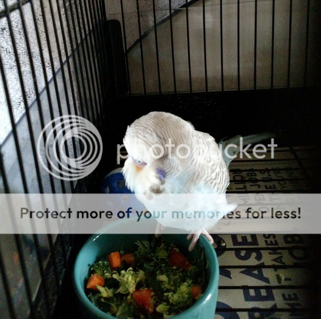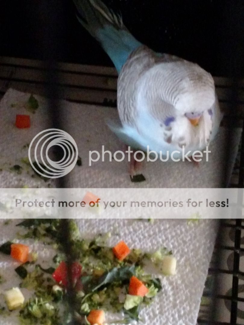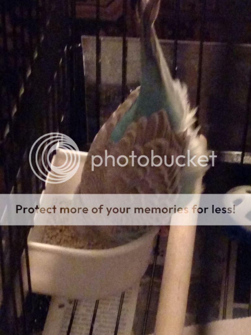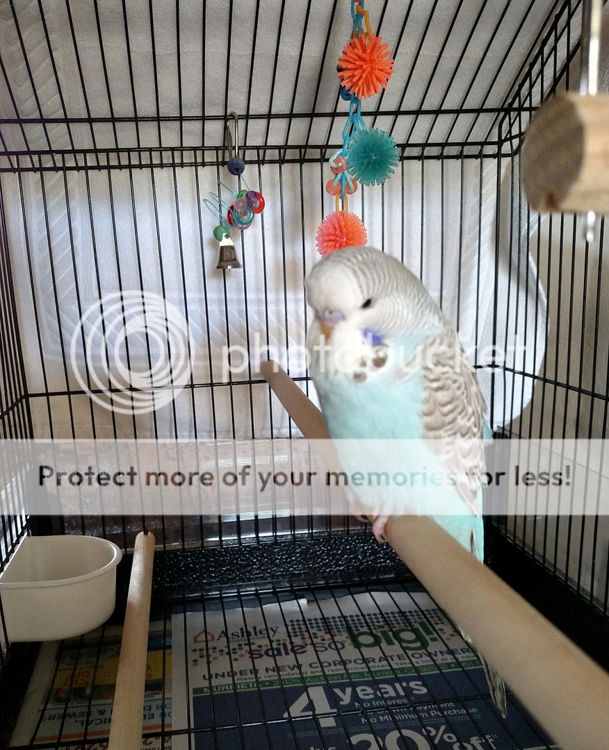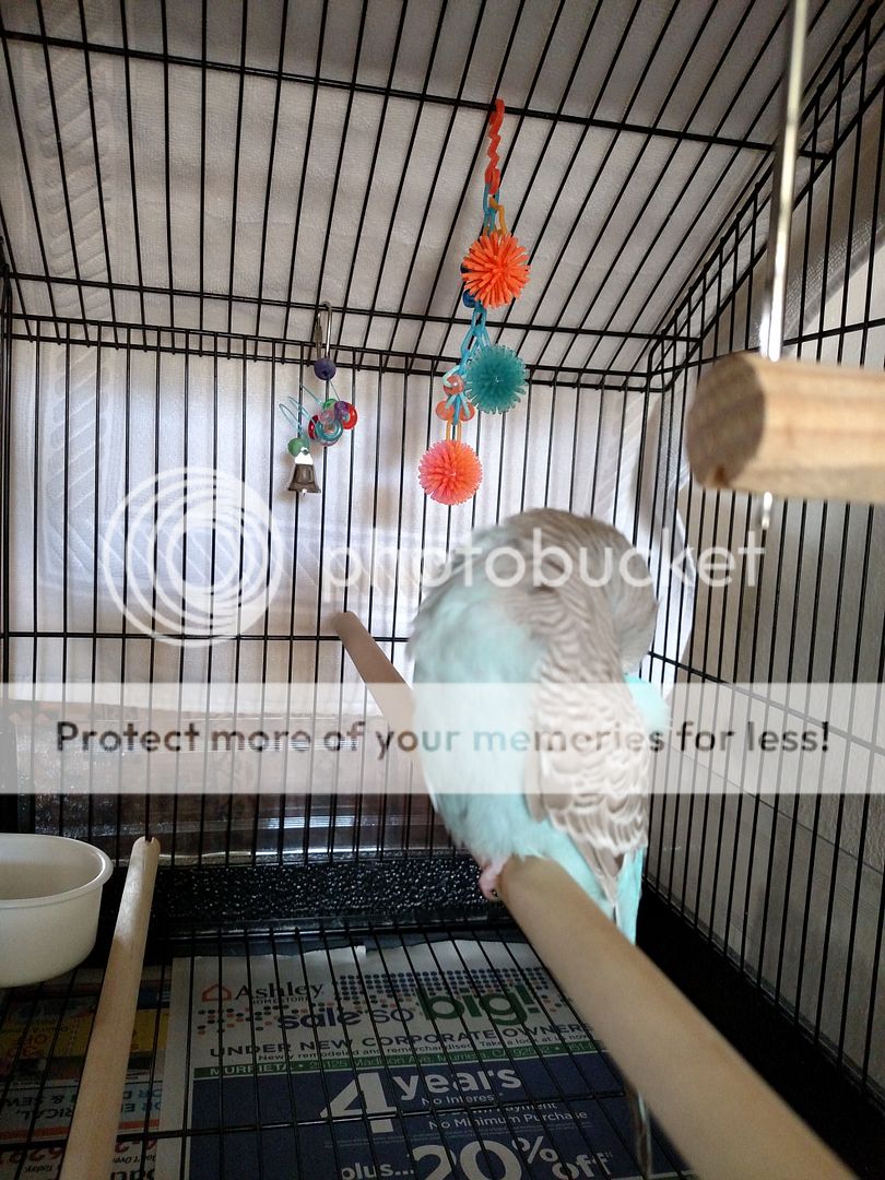 ! Chip is a hand fed tame budgie, so that helps, he is very calm. This is his quarantine cage. In the 'real' cage he won't have dowel perches, and will have a ton of toys. Being a cinnamon, his back is actually brown, although it looks gray in the pics. I love his color.