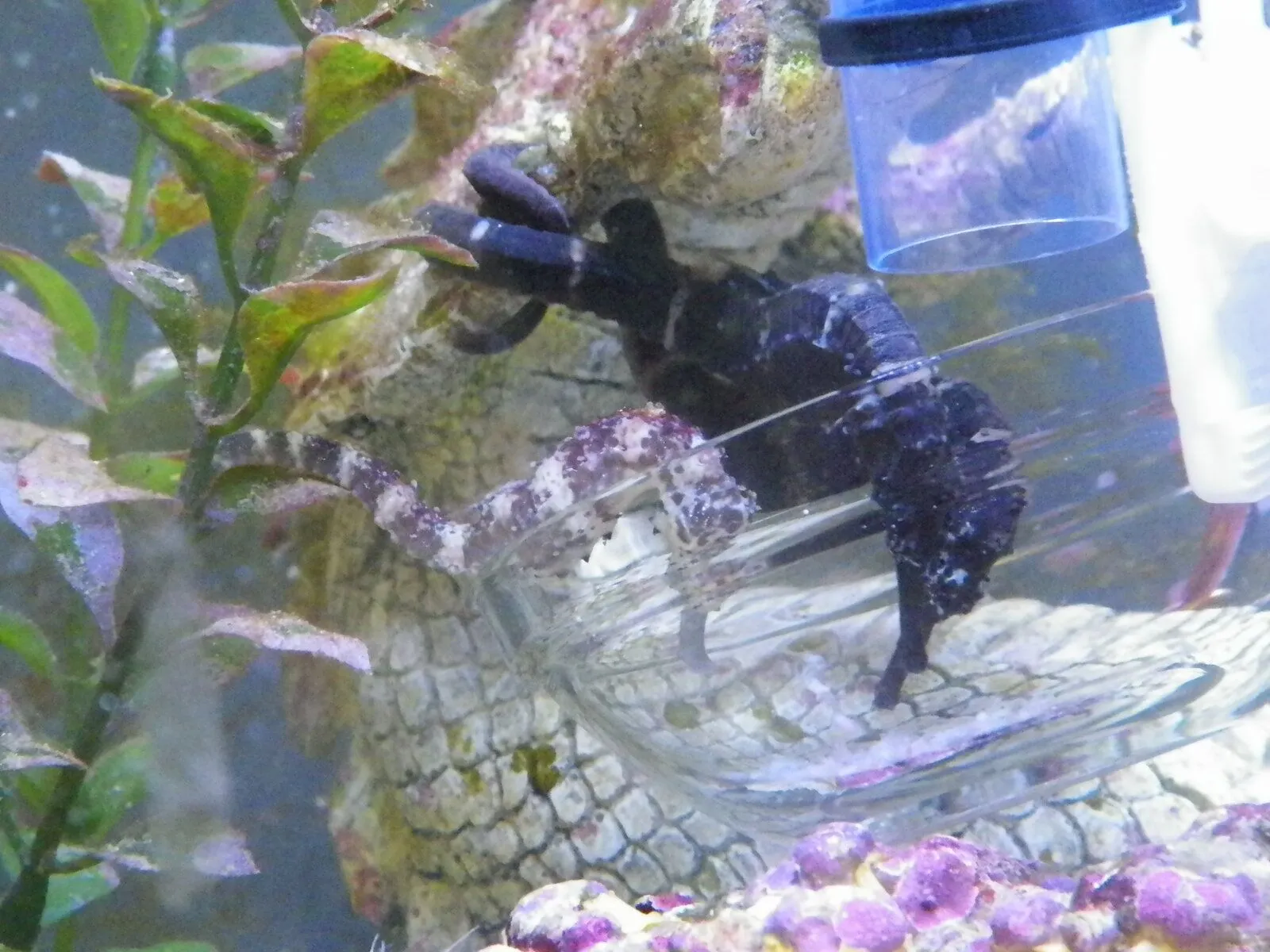 I trained them to eat their shrimp out of a glass bowl to cut down on waste and help keep tank from getting gross. The 3rd pic is my tiger tail girls eating from the bowl the lighter striped one I raised from a fry no bigger than a fingernail in a 10 gallon before she was big enough to add with my other girls. Seahorses are actually social.