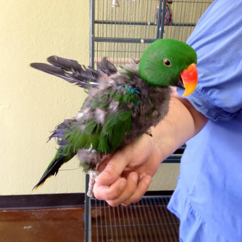 Hi! I have adopted a 17 year old male eclectus parrot. He has damaged himself pretty badly and is mostly downy. In addition, he has a dislocated wing which will not stay put if it is popped back in. He is currently staying at the rescue where I got him until I return to town. He may not be the prettiest bird on the planet, but he has a ton of personality! I took him off pellets and on fresh fruits and veggies. I also give him avi calm, a natural supplement that calms him down and helps with the plucking. His feathers are starting to grow in but if they don't all come back, it's ok.