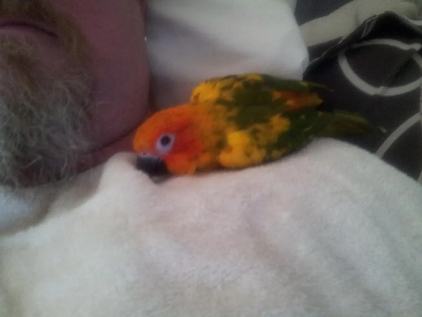 Got my wife a SC for our 8 yr anniv. Wife had a cockatiel when she was younger and really just like birds in general. I am a little surprised at how much I like the bird. Pepi adjusted pretty fast, he's about 5 weeks old now. We've had Pepi only a week, but Pepi ate from day one. We could handle Pepi the 1st day but I can now see Pepi was nervous/scared compared to now. The last 4-5 days Pepi now greets us with a high squeek. Or the same sound when we leave the room. Its interesting. We cannot get Pepi to hop up on a finger yet but is easy to catch and once Pepi is on your chest seems pretty content playing with my beard or trying to "kiss". I read not to let them "kiss" on you, germs and all that. I figure Pepi is really wanting us to regurgitate food. Pepi is a interesting critter with a lot of personality in a small package. My father really liked parrots and now I see why. Just wanted to check in.