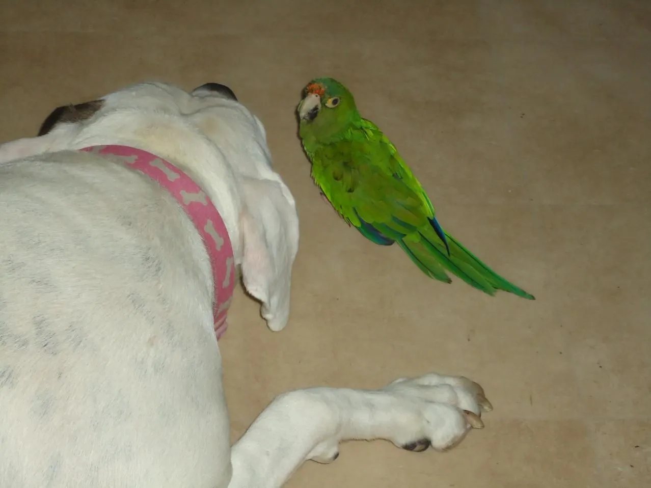 She think our dog is hers, gets very animated when we pet the dog in her presence. The cat is terrified of the bird which is quite hilarious when the bird charges our cat.
