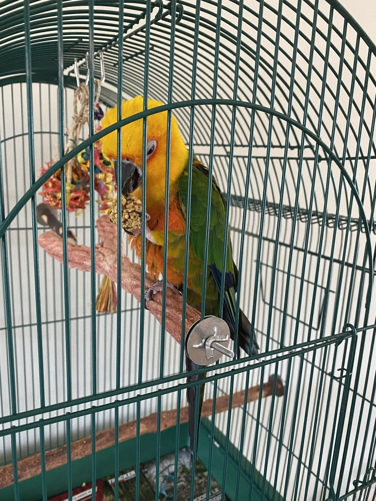 I’ll introduce Kiwi to start. Kiwi is a Jenday Conure. Kiwi is a little monster