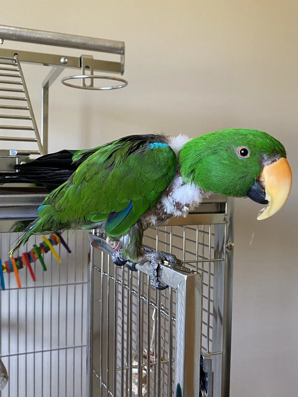 , and loves to get into anything/everything. He is a chainsaw on legs, and goes through a lot of toys. I’ve had Kiwi for 10+ years. I love conures. They are so full of energy, and are fun to train. Kiwi also loves to snuggle under people’s shirt, and into necks. He definitely has a conure instinct to burrow. Nextly we have Nico. Nico is an eclectus parrot. He’s the complete opposite of a conure. He is very slow like a sloth, and hates mornings. He tends to be more quiet, and docile. I adopted him from a shelter I volunteered at roughly 3 months ago. I fell in love with him. Nico isn’t a huge chewer, and doesn’t especially like toys. Nico took awhile to come out of his shell. He now pops out of his cage to see me after he wakes up (which can take awhile). He would be like a coffee drinker who doesn’t want to talk before their coffee is gone. He’s a very funny parrot. He’s obsessed with nutriberries. I give them as snacks, and if I leave the room briefly Nico will find a way to get to those nutriberries