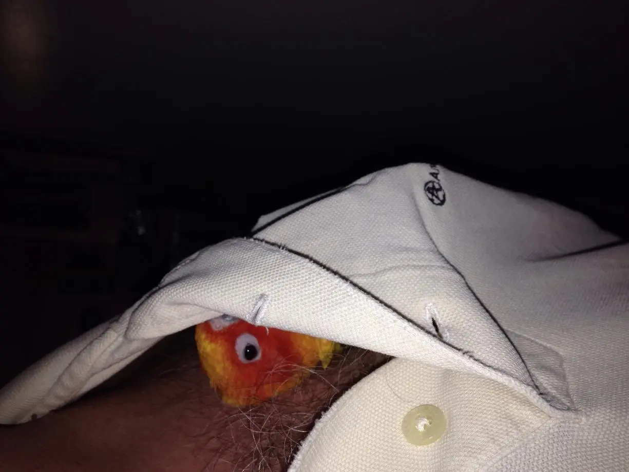 I put out my finger, he/she jumps up and climbs up and right in my shirt! I can do housework, go for a walk, etc. literally for hours and he/she will just hang out there! Inside mostly but pokes his head out if something seems interesting and then right back in! Such a character - the other day we all were laughing because my niece was wondering why my shirt was squawking - lol