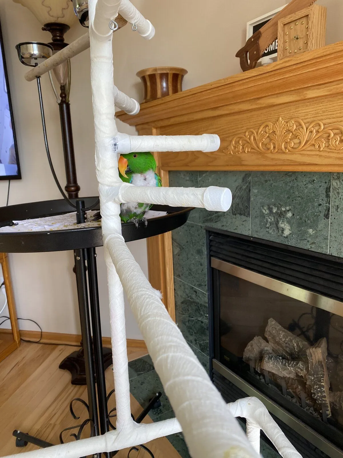 Are you saying "there's a playstand and a feeding stand and you choose to hang out on the poop catcher. Why?"