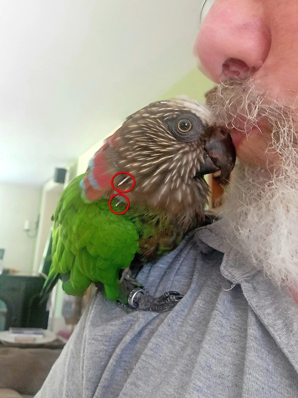 She always seems to have a couple on her head year round. Mostly noticeable when she raises her crest.But the pin feathers irritate me so much-