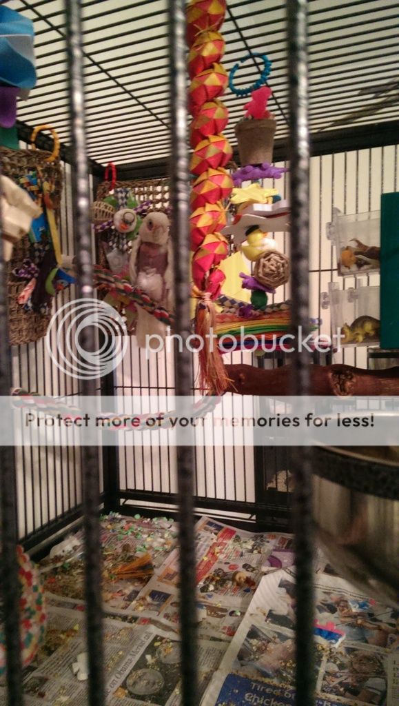 So far I am very impressed with him going the 24 hours without trying to rearrange his skin and feathers! While he has been able to go without it when outside his cage for awhile now he has always had issues going without it in the cage.