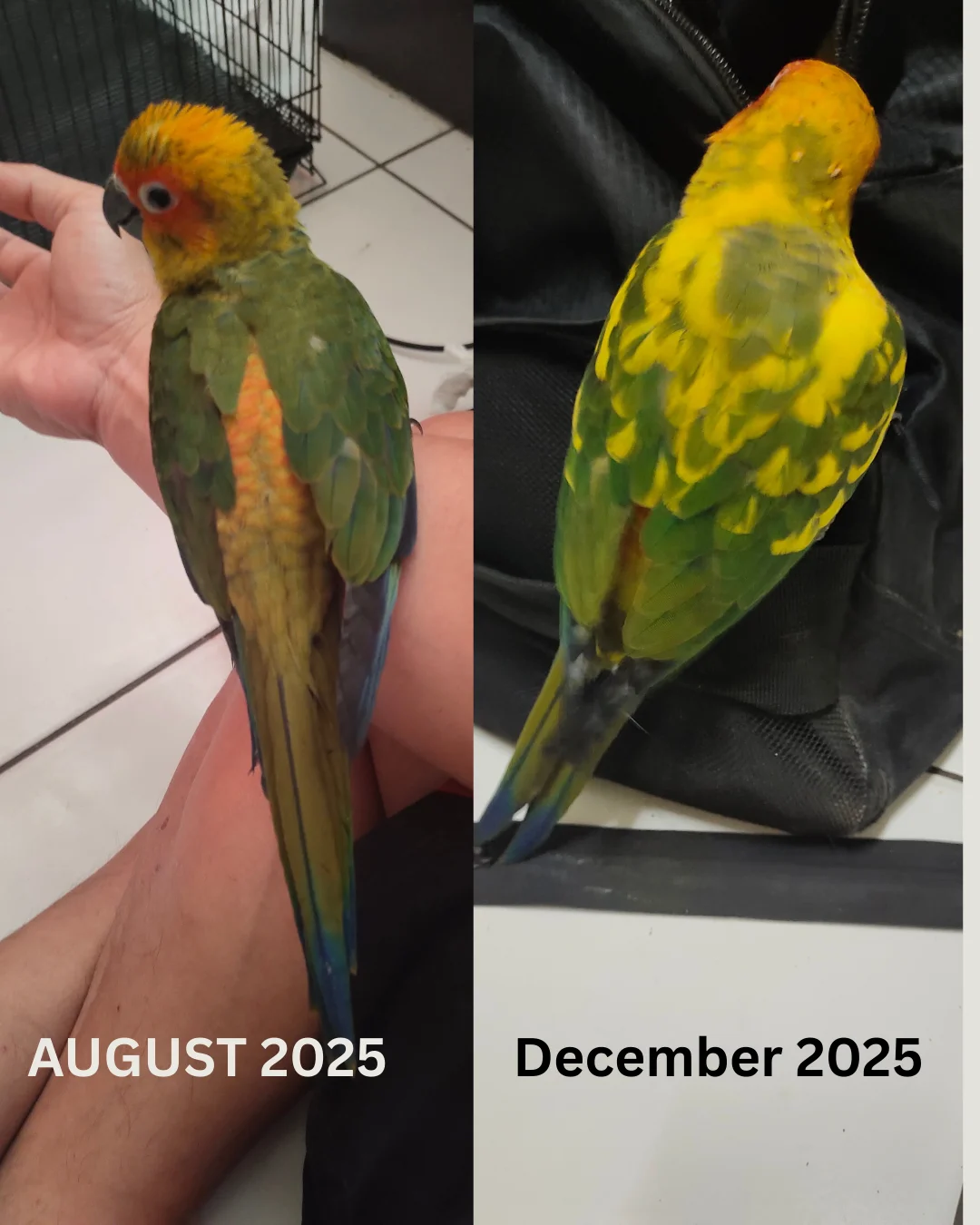 She was hatched June this year and on right side of photo collage is how her feathers have changed.