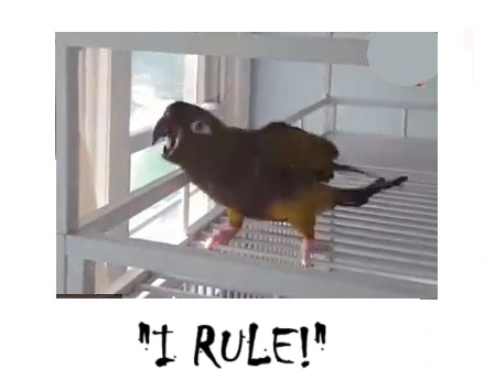 Most mornings coming out of his sleep cage, he has a poop on command and reaches up for a kiss, but sometimes he doesn’t want to do it, so he turns his head sideways, just like in this photo. If I ignore the head turn and say give us a kiss/don’t you want a kiss.. and reach toward him a little .. he will turn his head farther to almost right around and show me the back of it. lol.