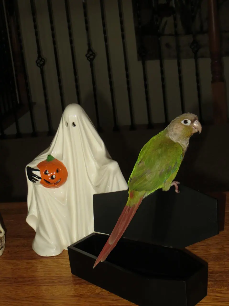 Please post a picture of your bird (with or without you) in either a Halloween costume, near/in/around Halloween decoration. :43: :43: :43: