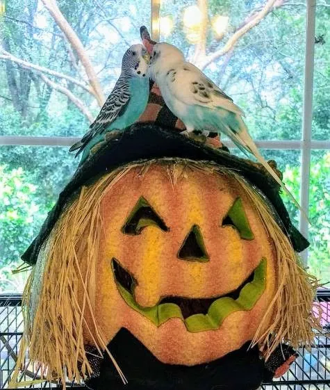 I feel the spotlight of this photo is the pumpkin not the budgies..