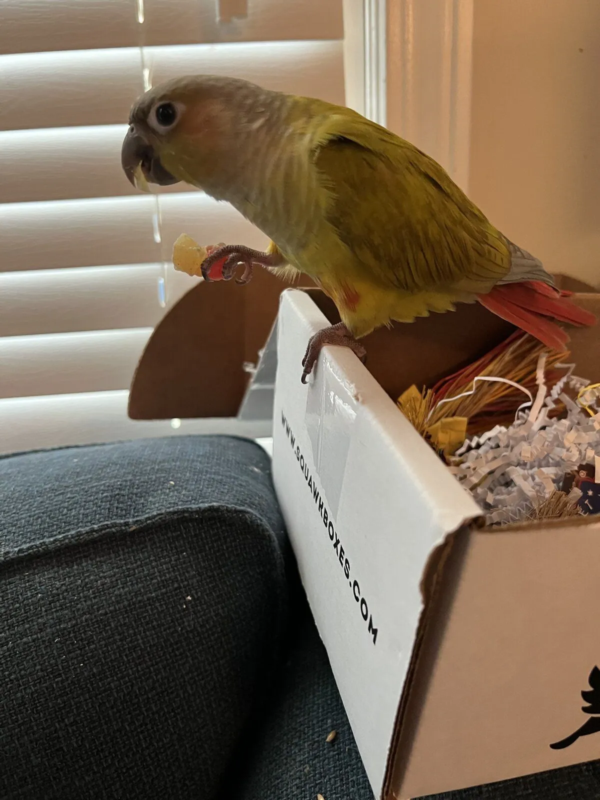 Ona's toy box- where all her good stuff is!I stole @ravvlet idea and made a foraging box from the Squawk Box. I put in seeds and treats and she likes it:
