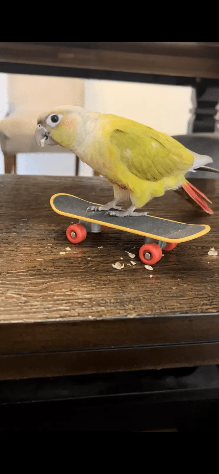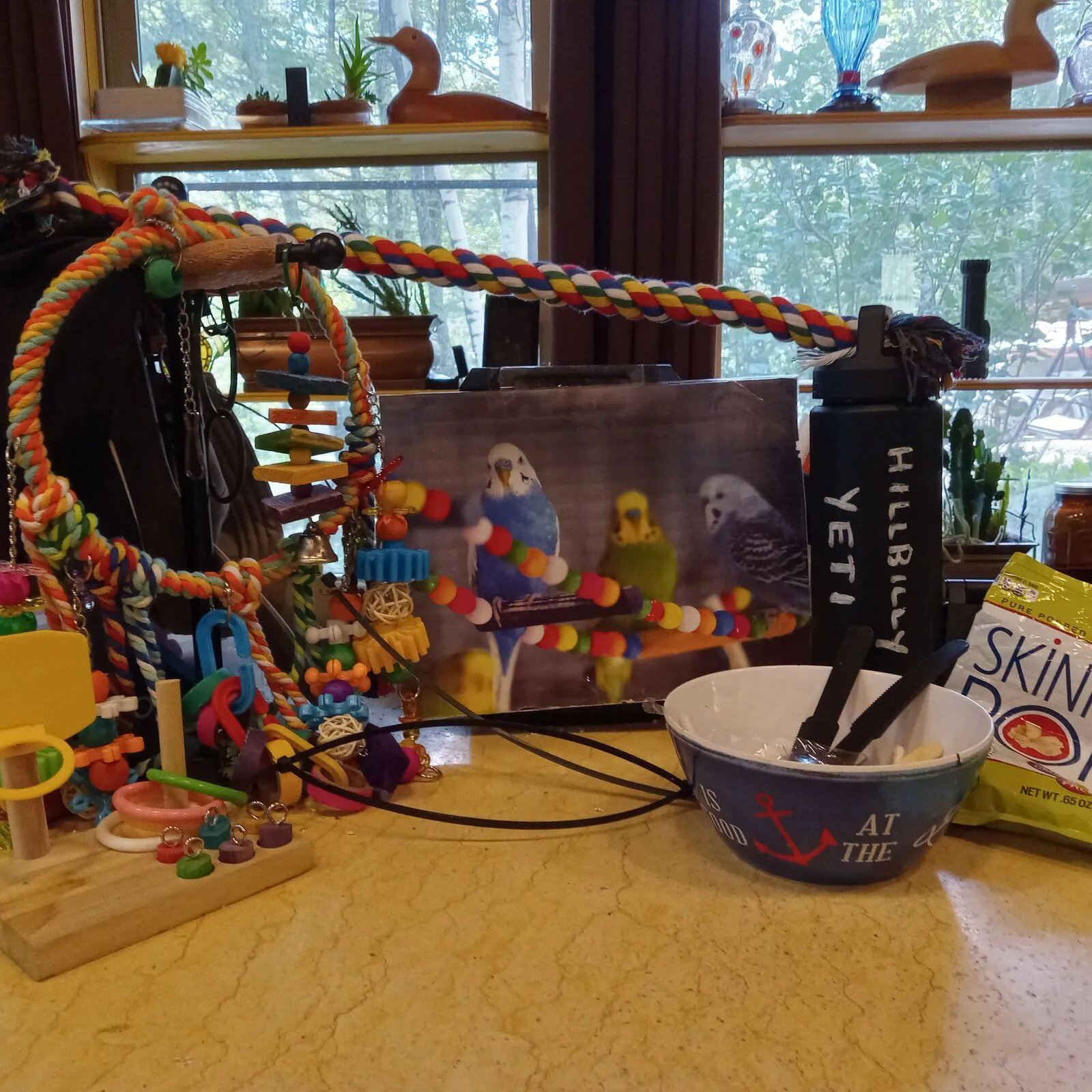 I keep a bowl on the kitchen table wirh Rocky's small "toys", like q-tips, zip-ties, bottle caps, washers and other bits of hardware, etc. Actually, the table is her playground, as you can see. The picture of the budgies- they're her friends.View attachment 53756