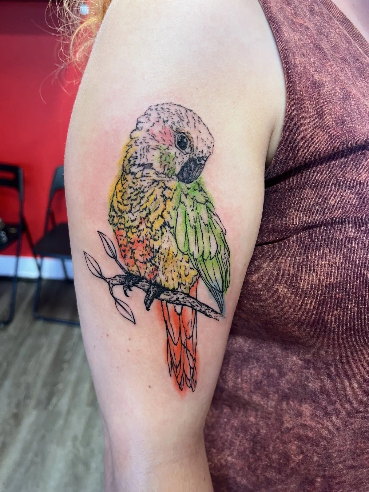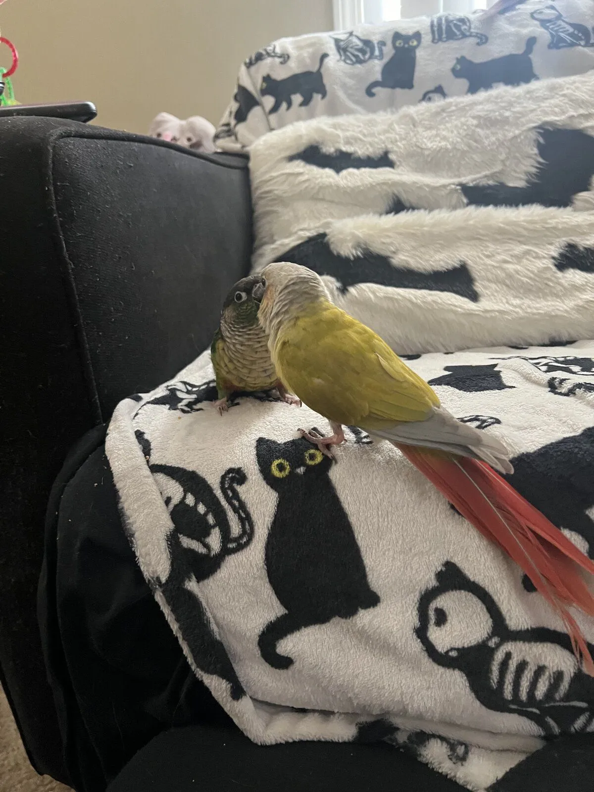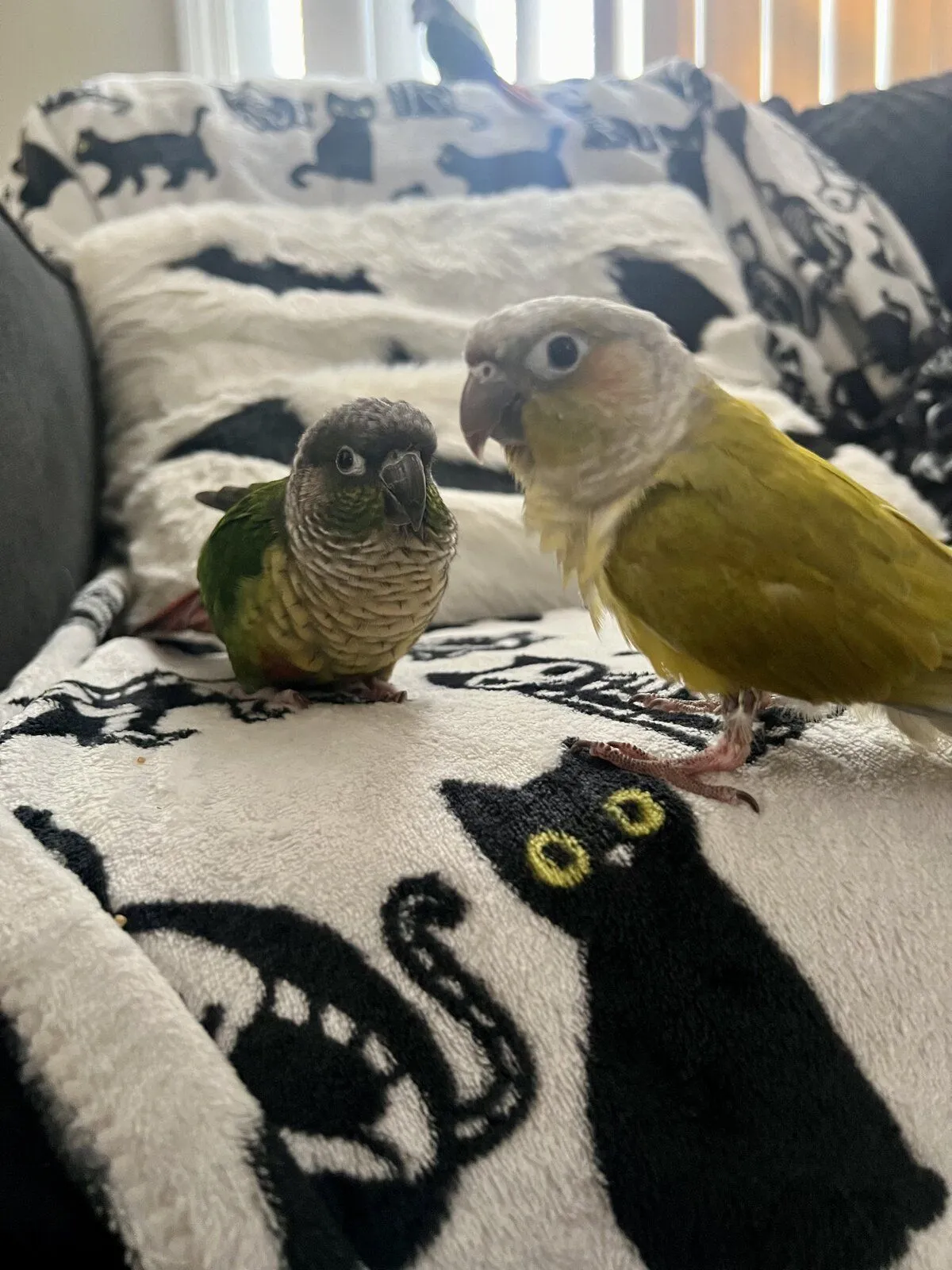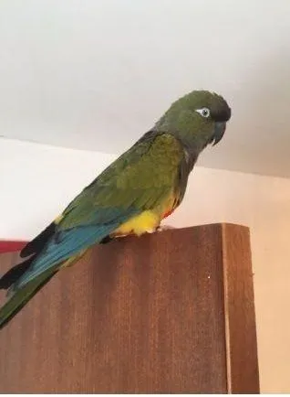 Went to see her bird sitter who was watching a pair of green cheeks. Ona ignored the other birds at first and then when she got curious she walked up to one and before we knew it they were kissing each other!