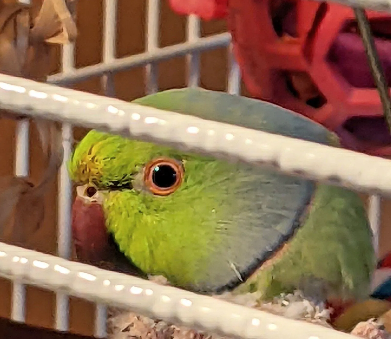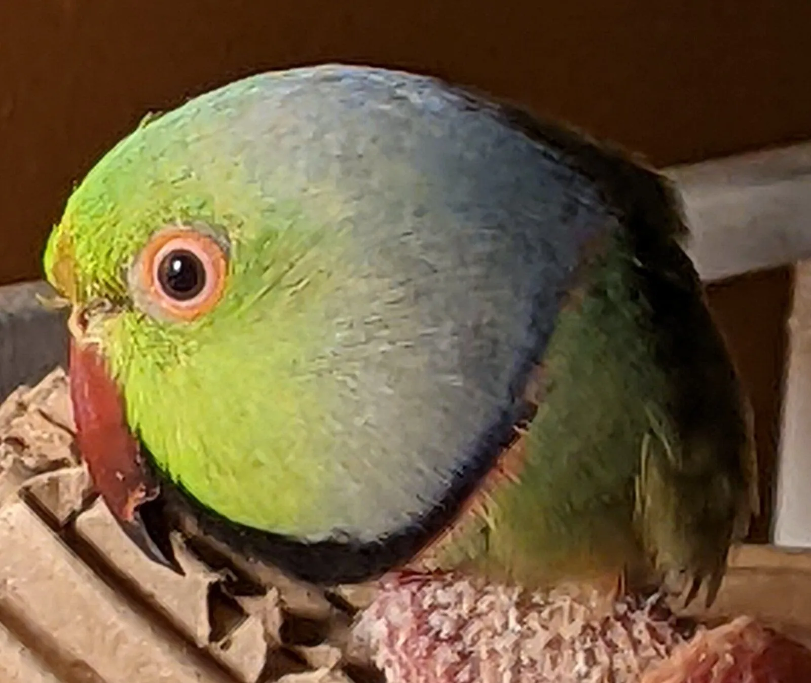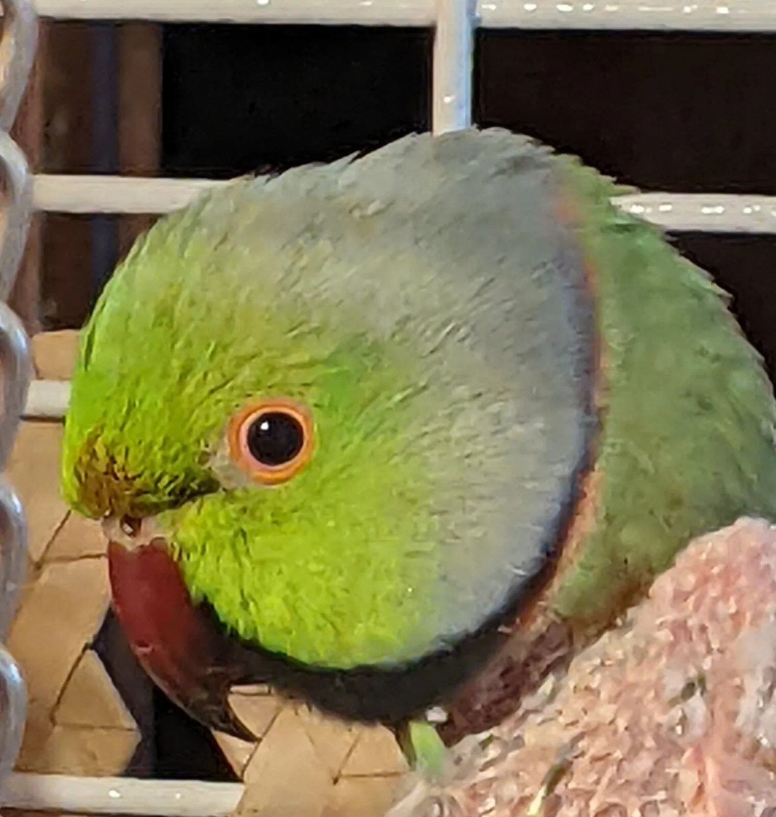 Visit at the parrot rescue 2 Mar - lighting isn't bright but you can see his iris, area around eye looks ok but there is feather staining above his nares - he was just finishing getting his ring so at first it looked like part of his dark eye bar