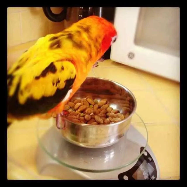 Boomer, our 3.8 ounce Sun Conure that hatched on Feb. 6th of this year.