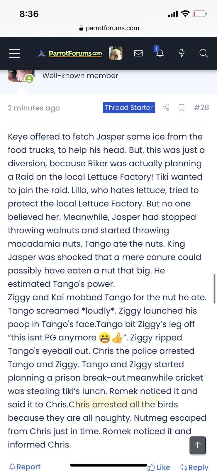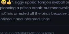 Ziggy and Kai mobbed Tango for the nut he ate. Tango screamed *loudly*. Ziggy launched his poop in Tango's face.Tango bit Ziggy’s leg off “this isnt PG anymore ”. Ziggy ripped Tango's eyeball out. Chris the police arrested Tango and Ziggy. Tango and Ziggy started planning a prison break-out.meanwhile cricket was stealing tiki’s lunch. Romek noticed it and said it to Chris.Chris arrested all the birds because they are all naughty