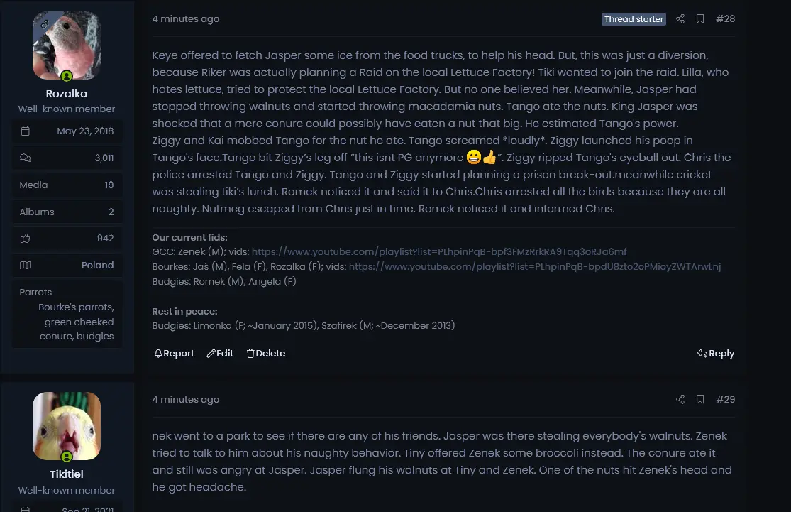 Ziggy and Kai mobbed Tango for the nut he ate. Tango screamed *loudly*. Ziggy launched his poop in Tango's face.Tango bit Ziggy’s leg off “this isnt PG anymore ”. Ziggy ripped Tango's eyeball out. Chris the police arrested Tango and Ziggy. Tango and Ziggy started planning a prison break-out.meanwhile cricket was stealing tiki’s lunch. Romek noticed it and said it to Chris. Chris arrested all the birds because they are all naughty. Nutmeg escaped from Chris just in time. Romek noticed it and informed Chris. Tango and ziggy escape freed all the birds and arrested chris. Romek and Zenek are happy to be free again. Cricket chewed their heads off. Then Angela flew to Cricket and bit him/her*.