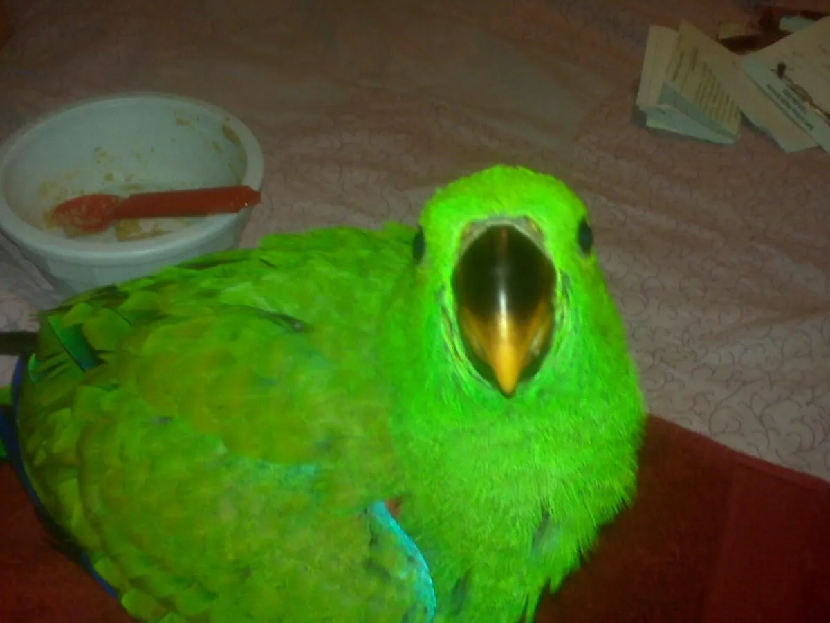 We are PhoenixRayne and Arawn. Arawn is a 3 month old Solomon Island Eclectus. I have had him for 4 1/2 weeks. He is still being handfed on occasion. Actually today is the first I haven't fed him. Usually he eats both day and night but has not asked for any so far. he eats Pretty bird pellets, a seed and nut mix , millet and apple. He hasn't developed a taste for veggies yet but what babies do. He is fledging now and is beautiful as they all are.
