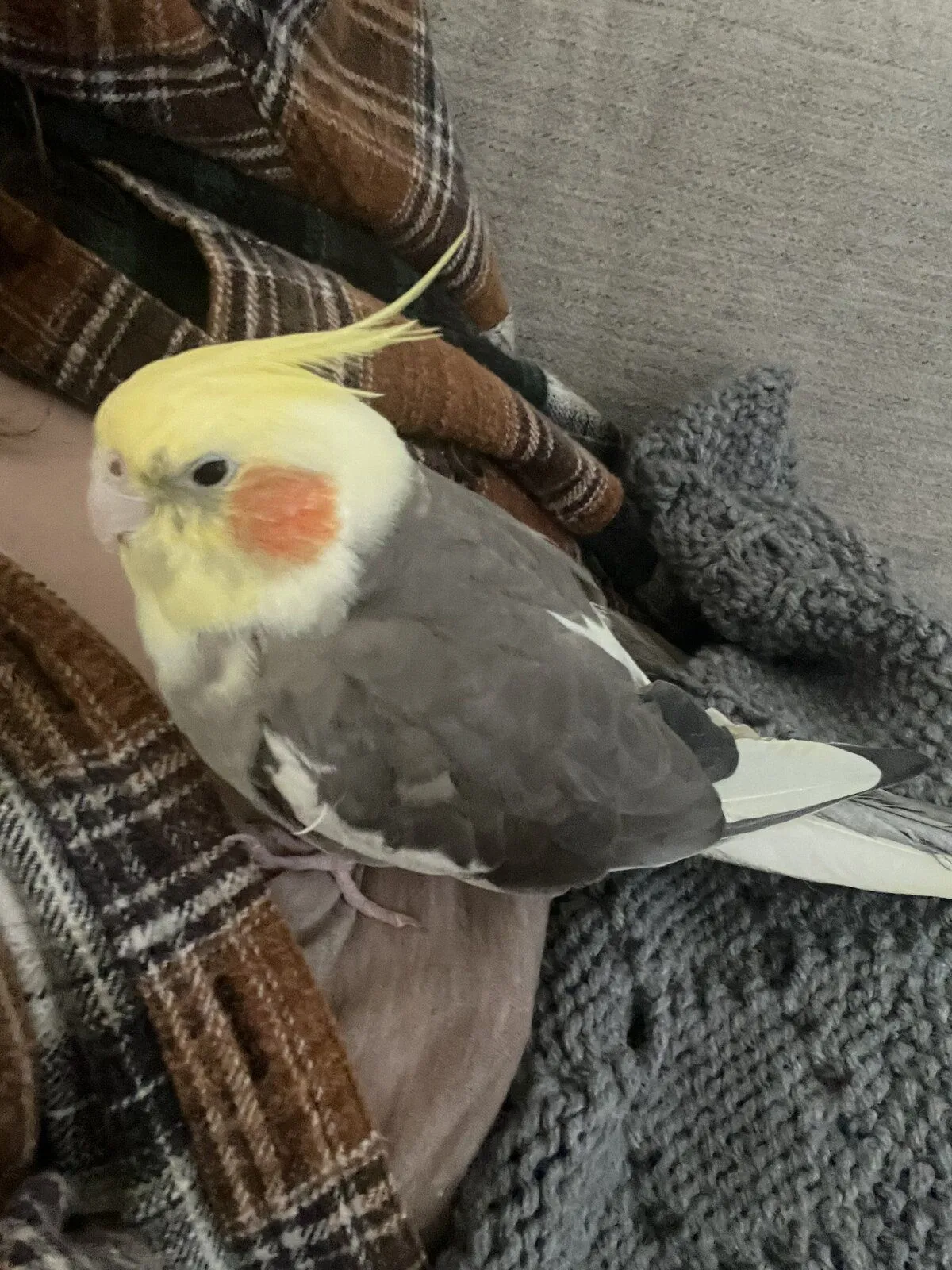 Bebe is a cockatiel, 6yo. Yellow head with orange cheeks and gray body.