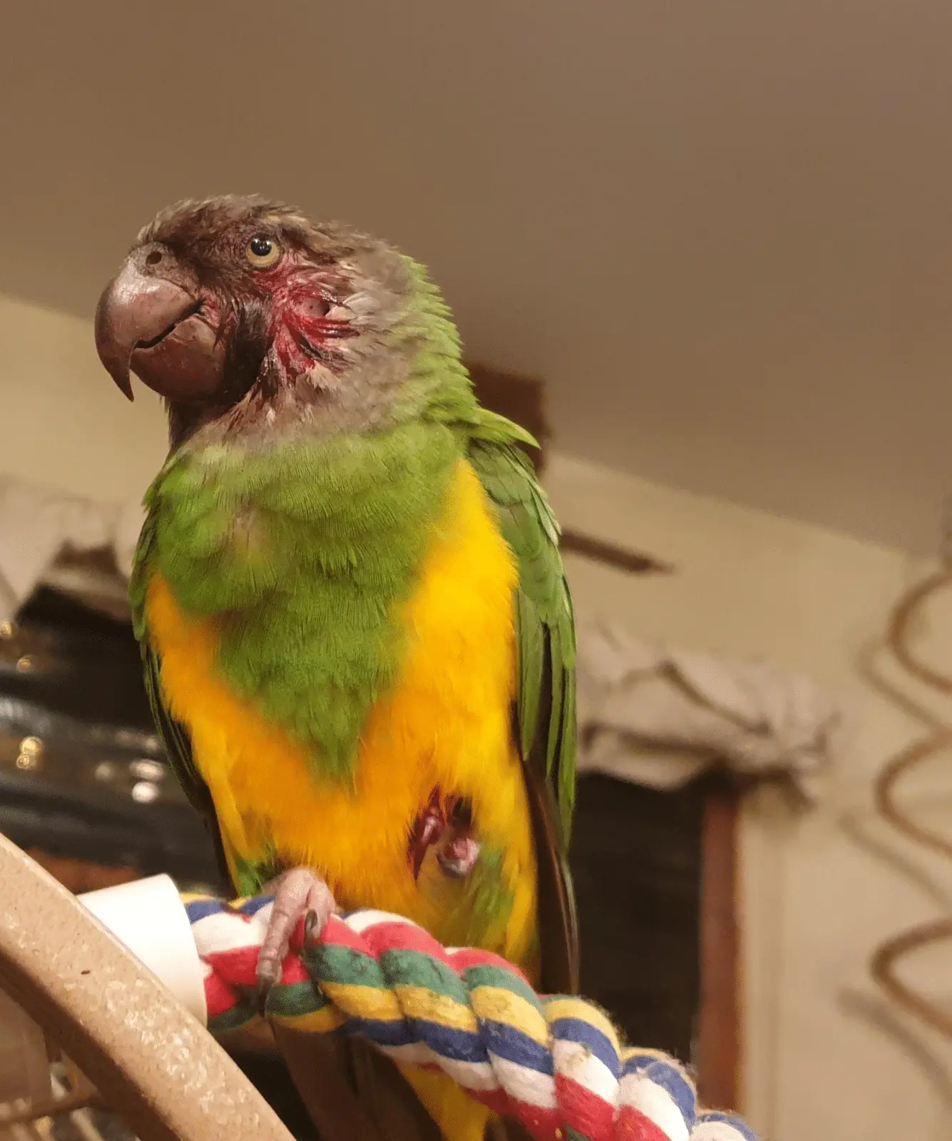 So I just came home and saw her face was still red. Whatever the substance is, it's red. I saw on one of the perches that there is dried blood. It is likely Snowy's, because the other budgies have no injuries whatsoever or dried blood on them.